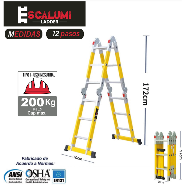 La Escalera Fibra de Vidrio Multiposición, Tipo I (Industrial), Dieléctrica (No Conduce Electricidad), con bandejas de apoyo, puede tomar varias formas empleables como escalera simple de apoyo de pared, tijera doble ascenso y plataforma de trabajo o andamio, para adaptarse a cualquier tipo de trabajo, resistencia al uso y manejo en sus trabajos de altura, elaborada de Plástico reforzado con Fibra de Vidrio (PRFV) y peldaños de Aluminio con superficie antideslizante, capacidad dieléctrica de C.A: 90 Kv y C.D: 25 Kv, el sistema de articulación de encastre de seguridad le garantiza una función rápida y segura de escalera a través del desenclavamiento de una parte de la articulación con una sola mano, tolerancia de carga máxima confirmada de 200 Kg, patas con antideslizantes que genera mayor firmeza durante su uso