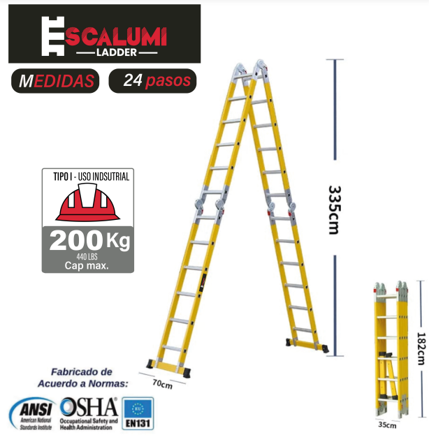 La Escalera Fibra de Vidrio Multiposición, Tipo I (Industrial), Dieléctrica (No Conduce Electricidad), con bandejas de apoyo, puede tomar varias formas empleables como escalera simple de apoyo de pared, tijera doble ascenso y plataforma de trabajo o andamio, para adaptarse a cualquier tipo de trabajo, resistencia al uso y manejo en sus trabajos de altura, elaborada de Plástico reforzado con Fibra de Vidrio (PRFV) y peldaños de Aluminio con superficie antideslizante, capacidad dieléctrica de C.A: 90 Kv y C.D: 25 Kv, el sistema de articulación de encastre de seguridad le garantiza una función rápida y segura de escalera a través del desenclavamiento de una parte de la articulación con una sola mano, tolerancia de carga máxima confirmada de 200 Kg, patas con antideslizantes que genera mayor firmeza durante su uso