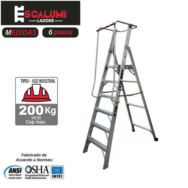 Las escaleras Plataforma Escalumi Ladder tiene sus rieles fabricados en PRFV/FRP (Plástico Reforzado en Fibra de Vidrio), un material no conductor de electricidad, lo que hacen que esta escalera sea ideal para trabajar en ambientes muy exigentes con riesgo eléctrico, corrosión y exposición a la intemperie. Con una capacidad de carga de más de 175kg, nuestras escaleras son de uso pesado y duraderas. Uso de almacenes, interiores y exteriores, para trabajos prolongados, dando mayor comodidad y seguridad al usuario. Las zapatas antideslizantes se adaptan al lugar donde se utilice la escalera brindando excelente estabilidad en terreno plano. Diseñadas con estructura de fibra de vidrio de alta resistencia, zapatas antideslizantes, uso pesado para toda aplicación industrial.